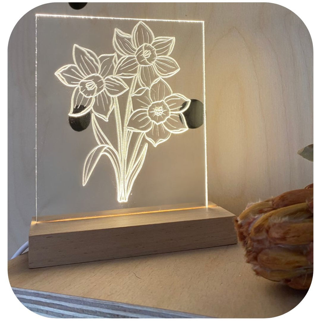 Each card is made from eco-friendly recycled acrylic, featuring the iconic daffodil, which represents renewal, hope, and the pride of Wales. The USB-powered LED base bathes your space in a warm, golden glow, capturing the cheerful essence of spring. Perfect for bringing the beauty of nature indoors, the Daffodil Luminary Art Card Set adds a touch of seasonal charm and Welsh symbolism to any room.